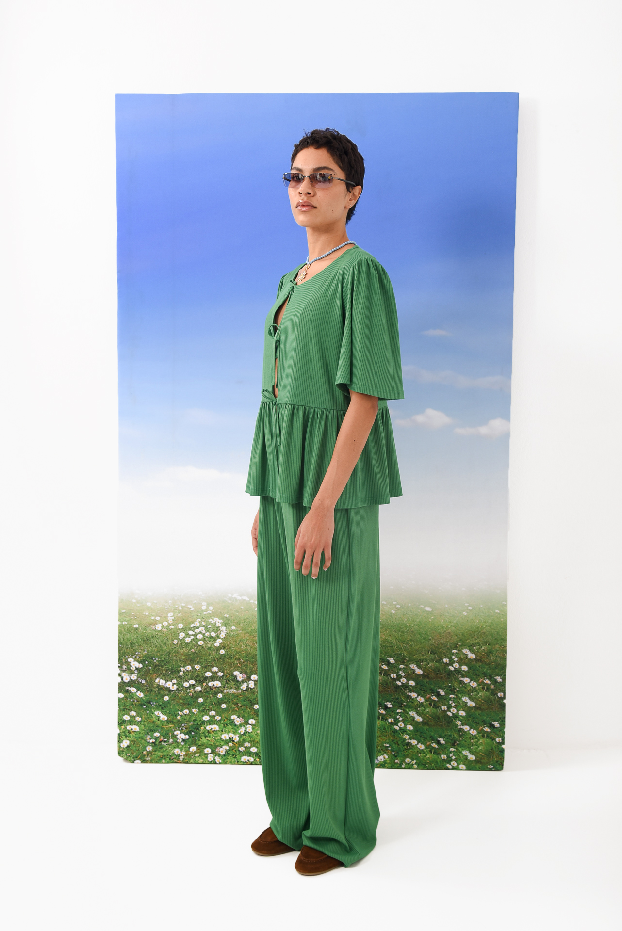 The Tanned Top blends comfort with effortless style. Designed in a soft ribbed fabric, it features a round neckline with delicate front tie details and short sleeves. The relaxed fit flows into a gently gathered peplum hem, creating a flattering silhouette. Easy to wear and versatile, it pairs perfectly with the matching Tanned Pants & Bra or your everyday essentials.