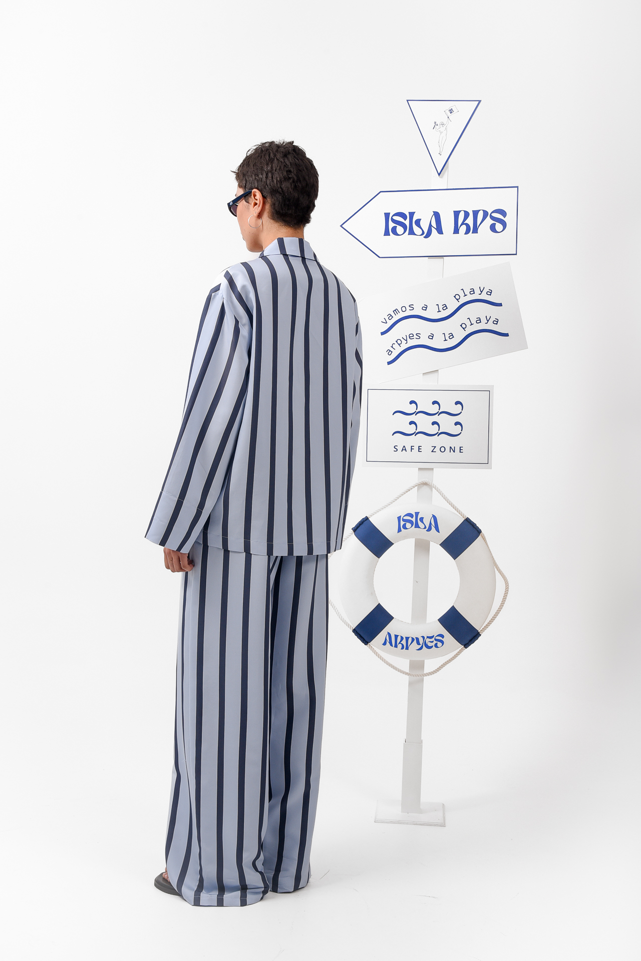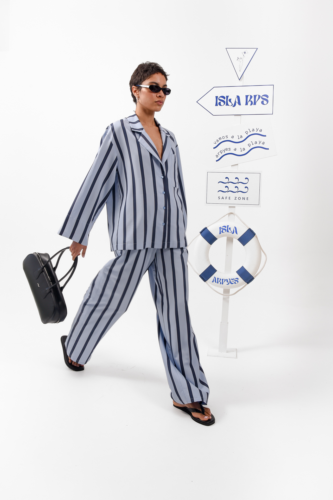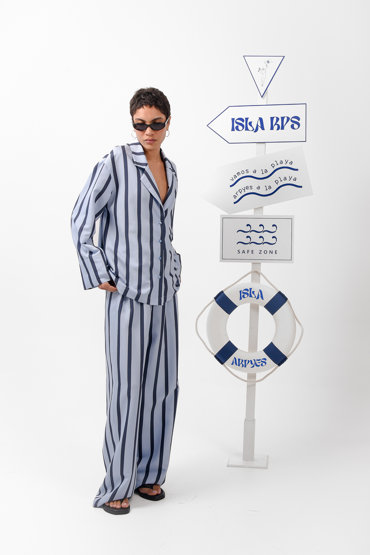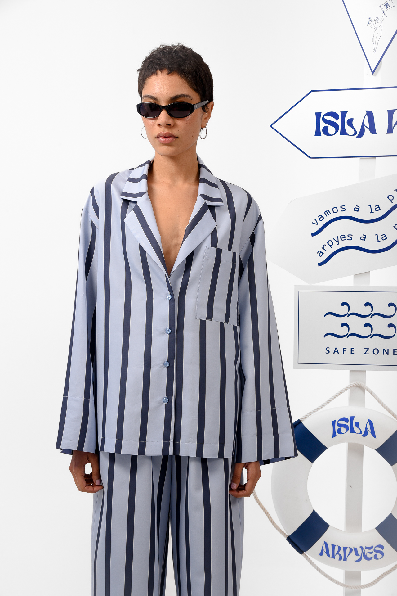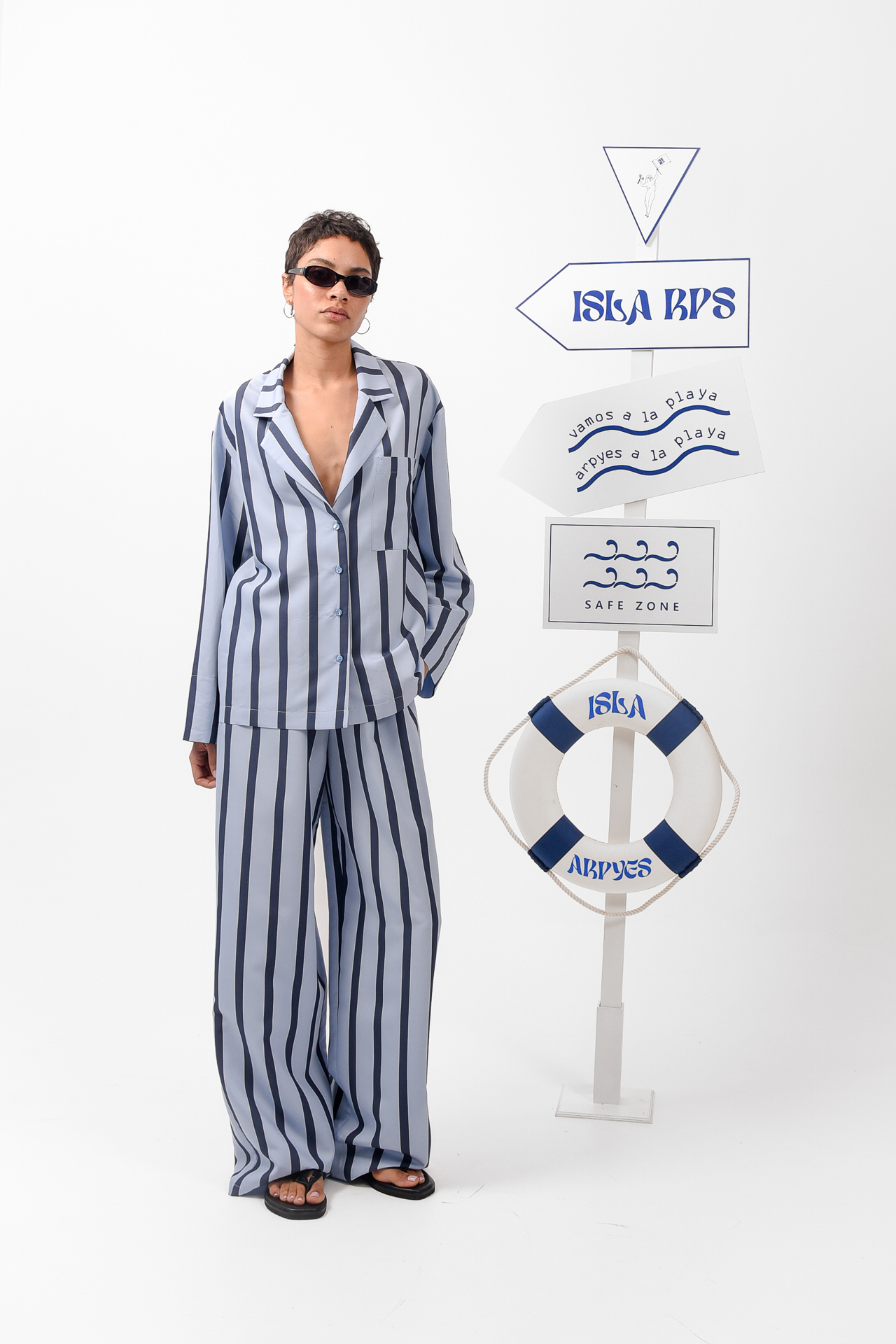 Bali Shirt is crafted from smooth, lightweight striped fabric, designed for effortless comfort and relaxed elegance. Featuring a soft tailored collar, long sleeves, and a front button closure, it blends a pajama-inspired ease with a refined silhouette. Finished with a chest pocket and an easy, fluid fit, it can be worn on its own or paired with the matching trousers for a coordinated, laid-back look.