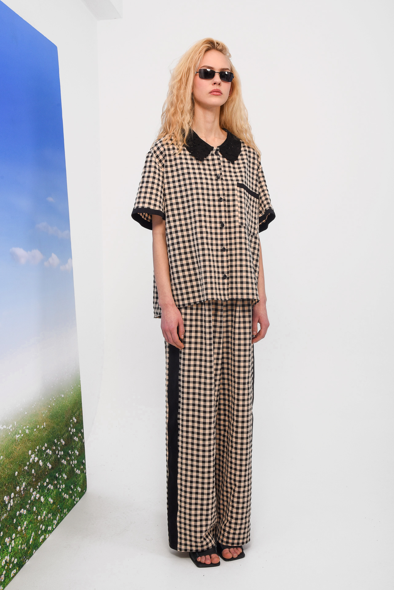 The Reef Pants are relaxed, wide-leg pants designed for effortless comfort and movement. They feature a high-rise elastic waistband for an easy fit and a fluid silhouette that drapes naturally through the leg. A contrast side panel adds a subtle graphic detail, while the lightweight feel keeps them comfortable for everyday wear. Perfect to style with the matching Reef Shirt or your favorite simple top.